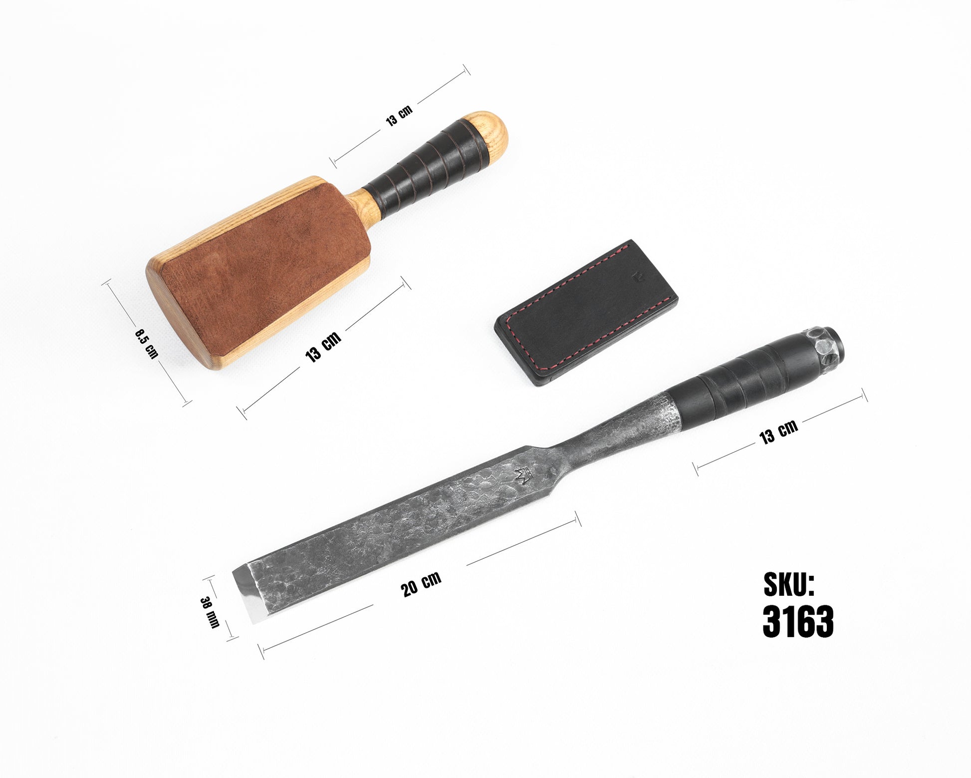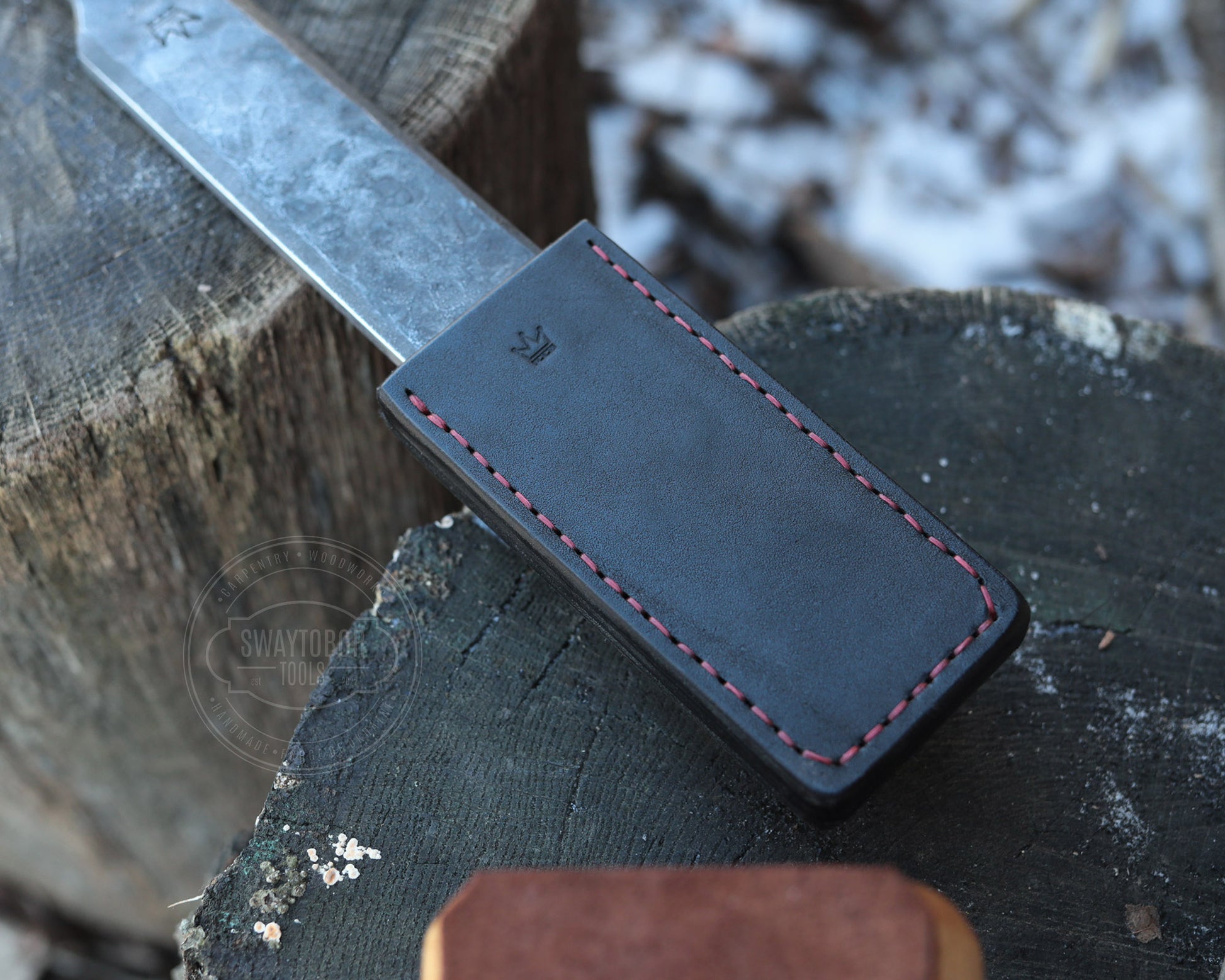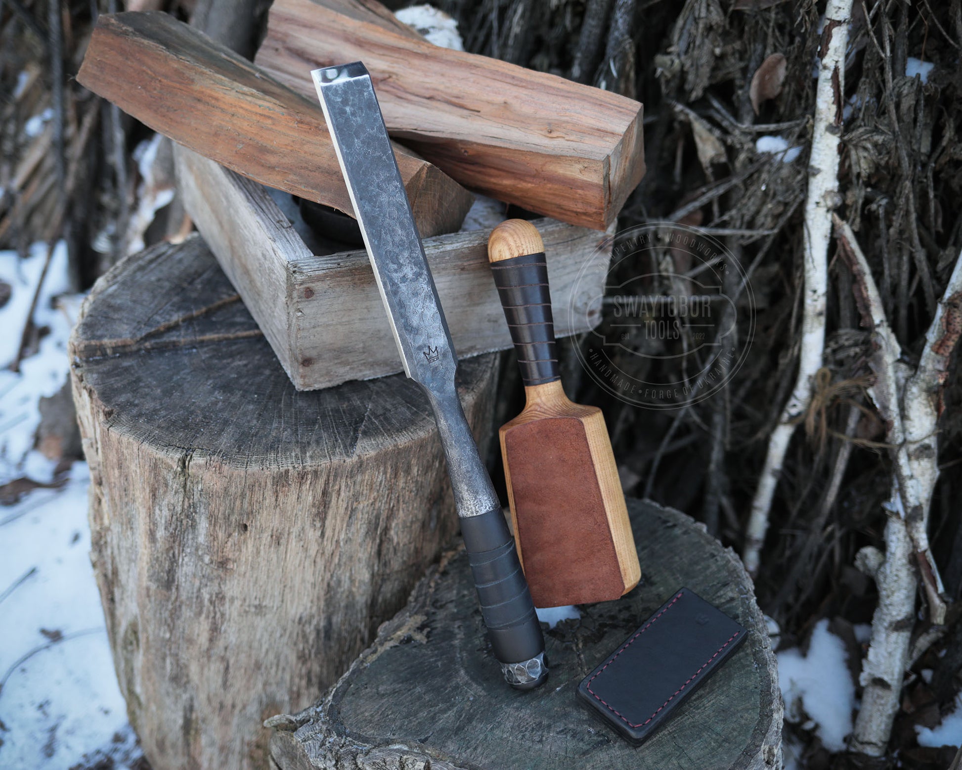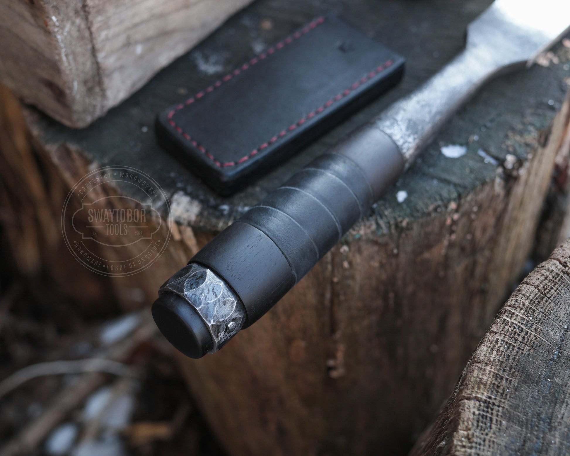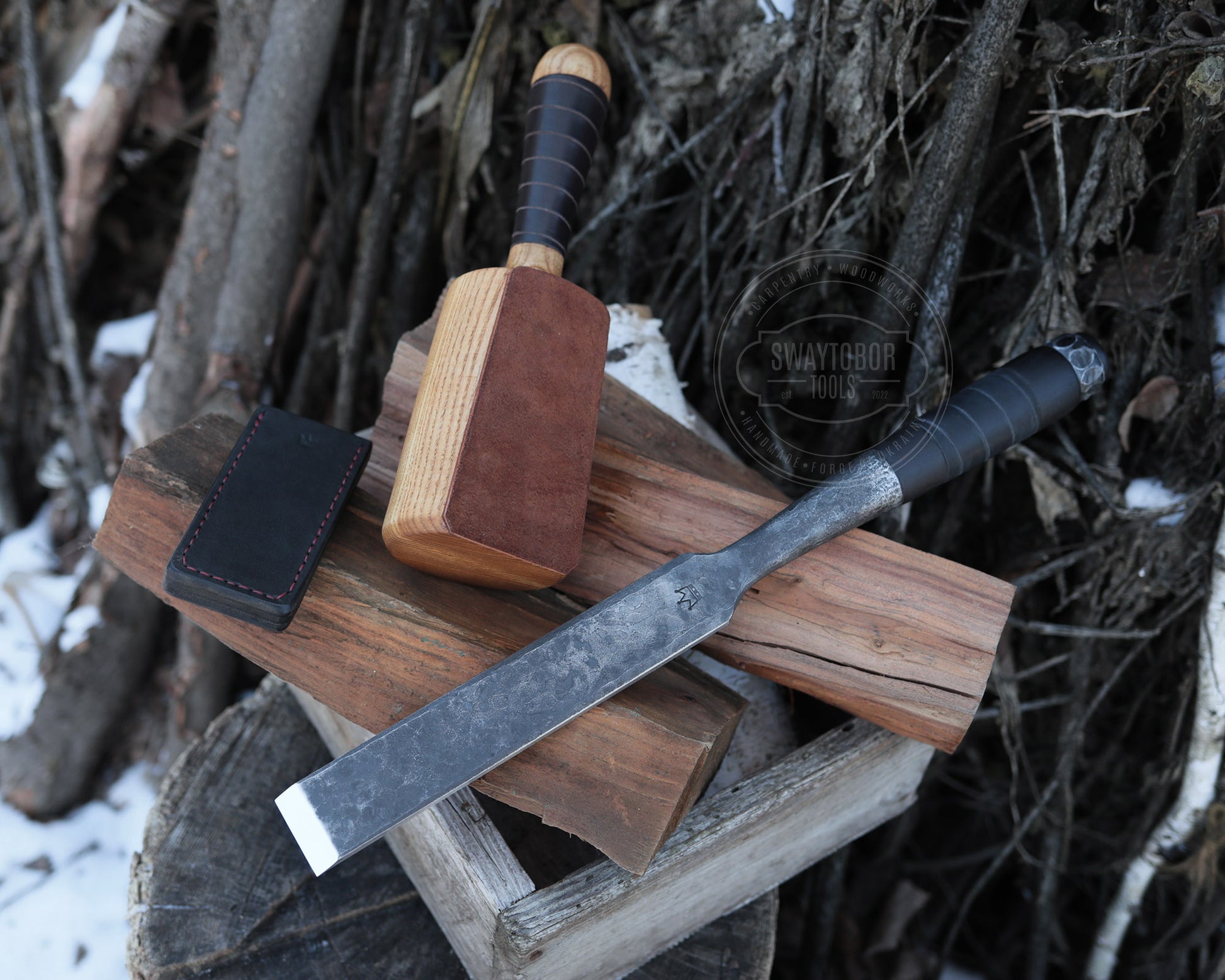 Set, bestehend aus Schwerem Zimmerereisen, BLACK EDITION, von Hand geschmiedet, mit hochwertiger Lederscheide sowie hochwertigem Klüpfel aus Eschenholz