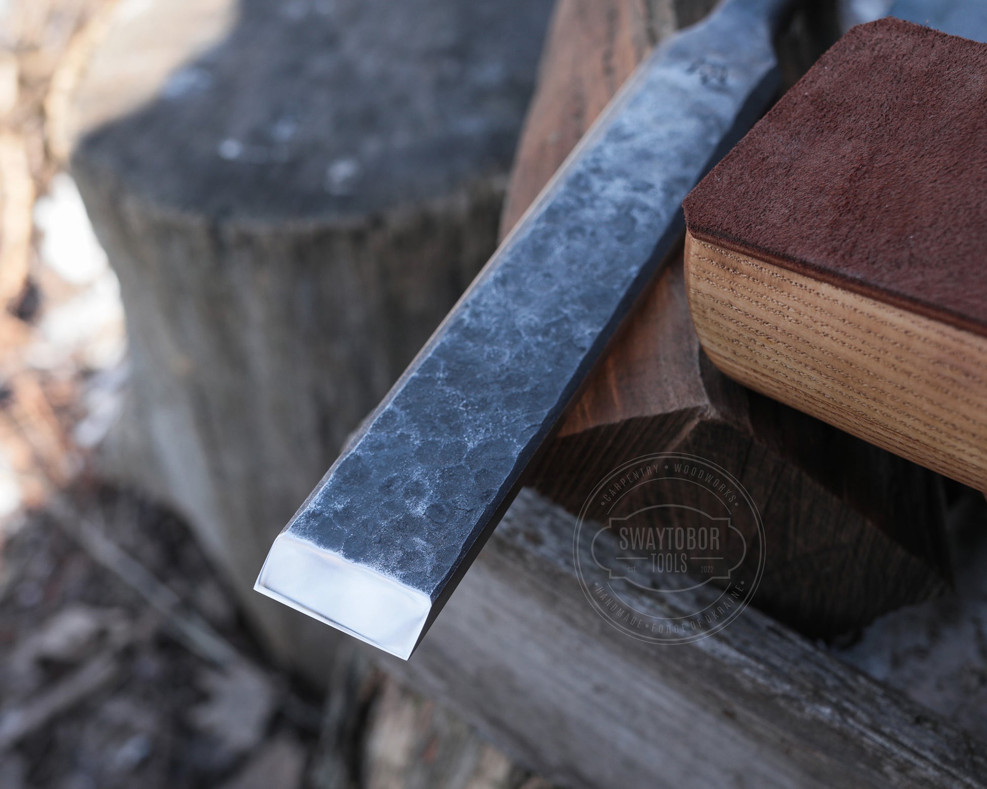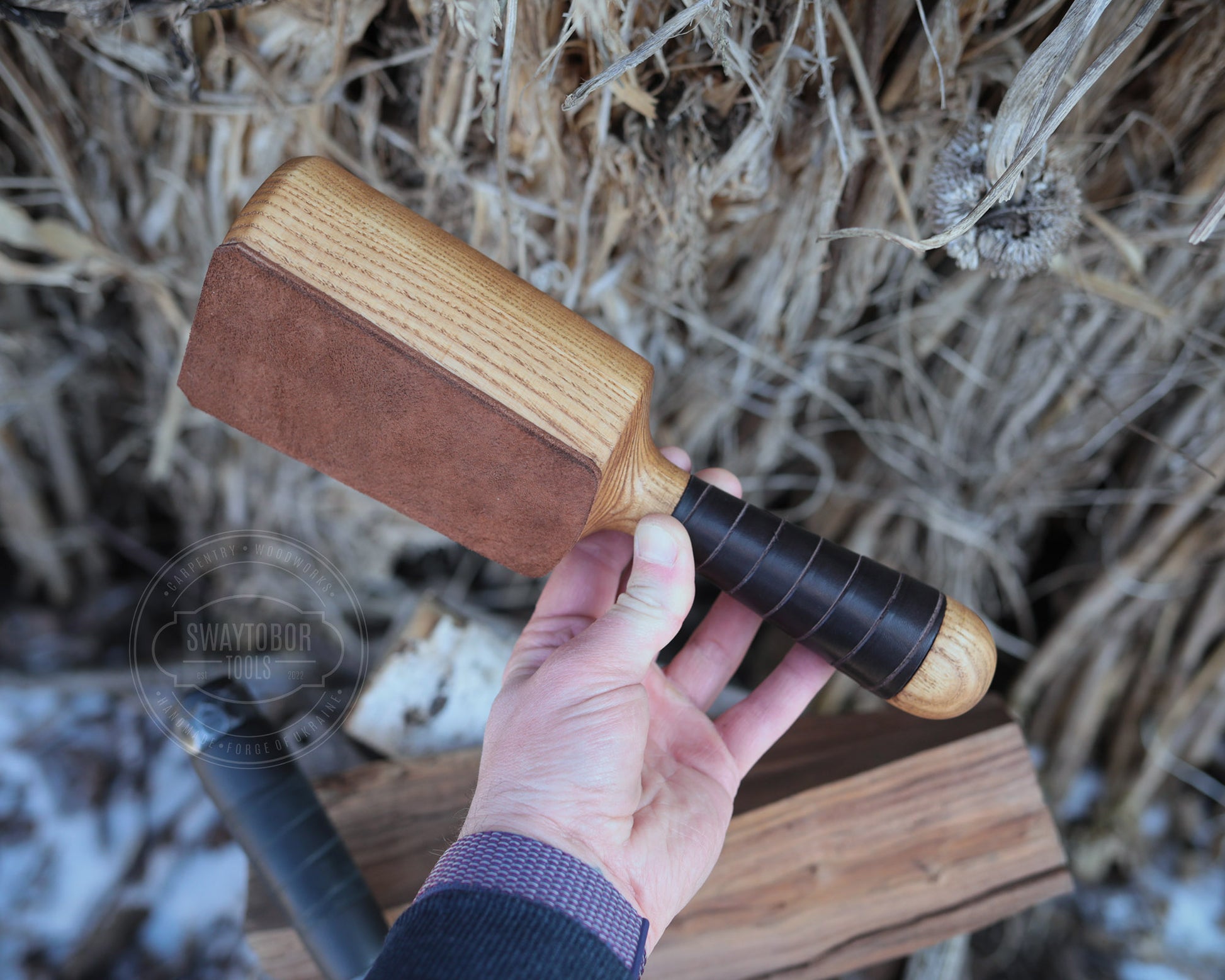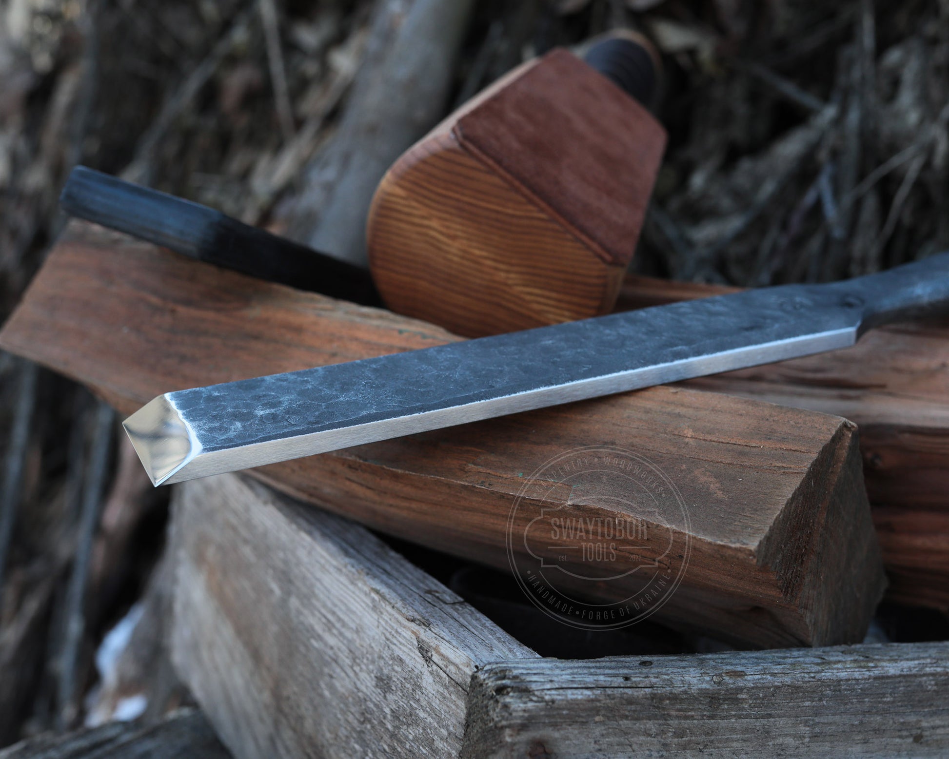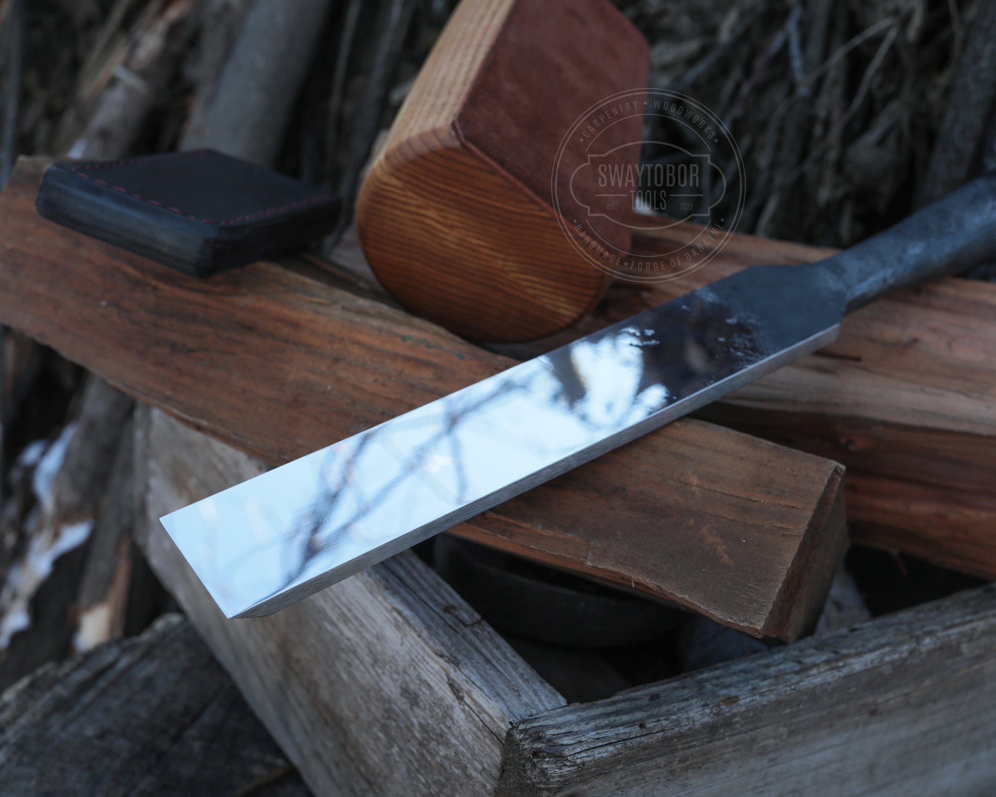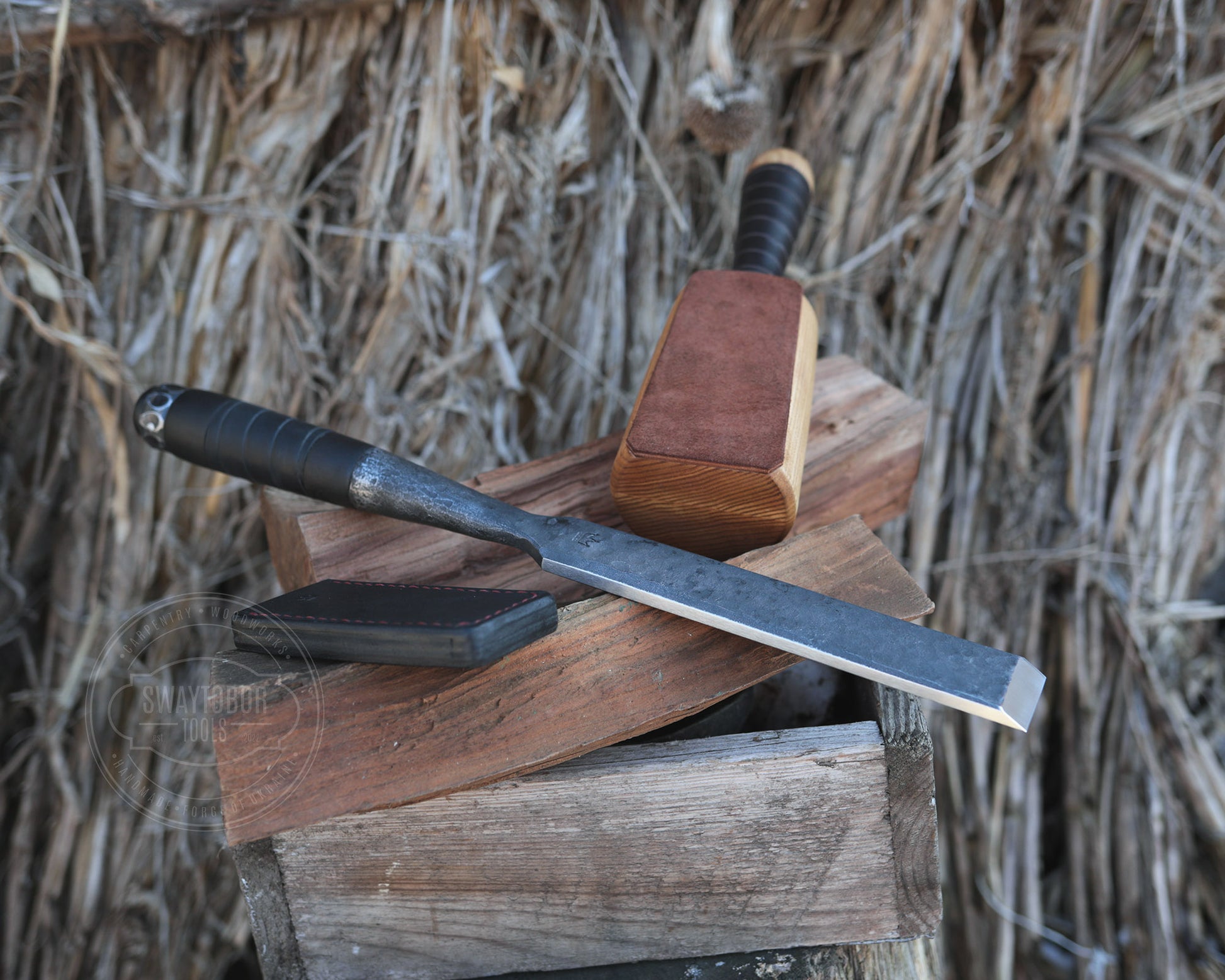Set, bestehend aus Schwerem Zimmerereisen, BLACK EDITION, von Hand geschmiedet, mit hochwertiger Lederscheide sowie hochwertigem Klüpfel aus Eschenholz