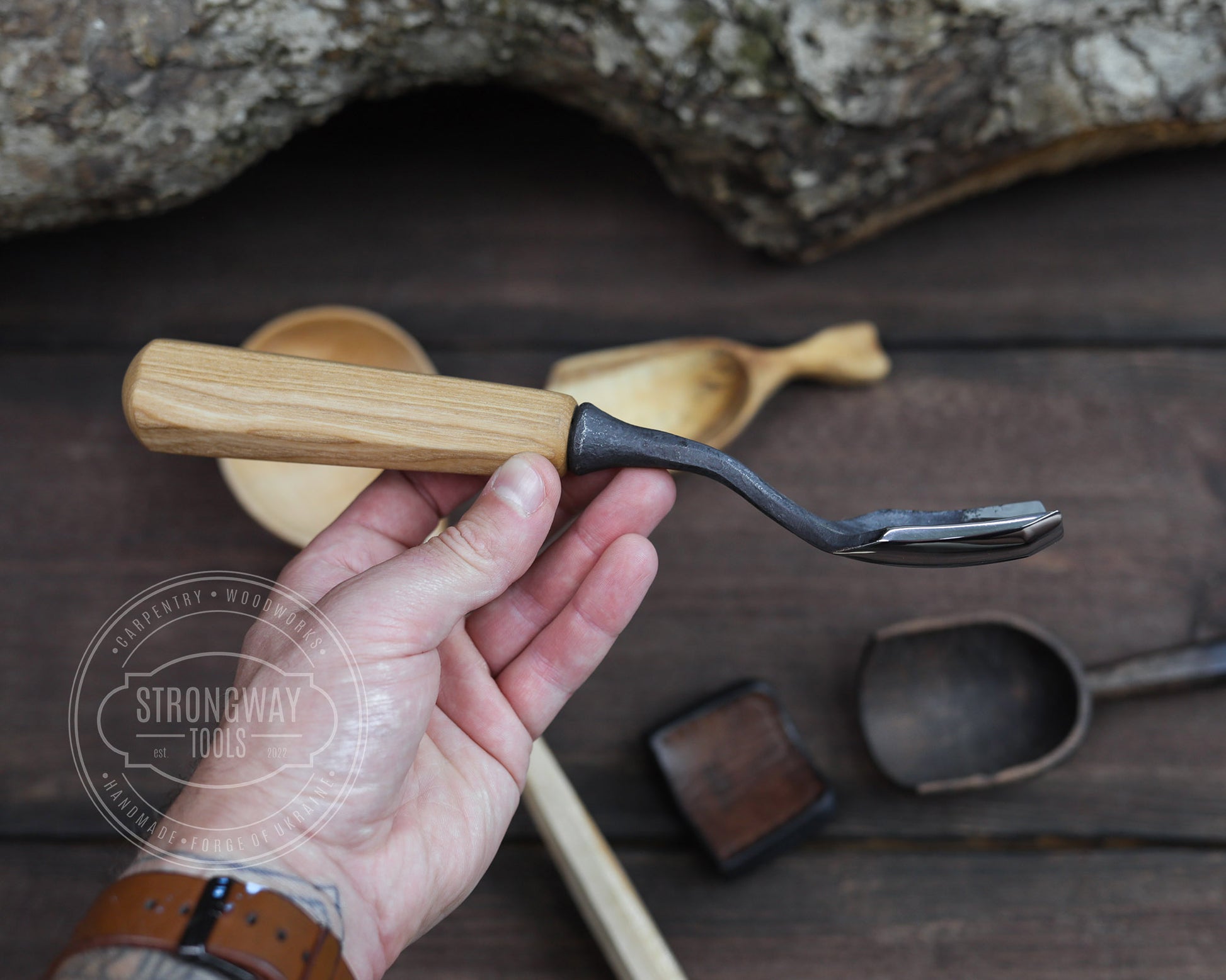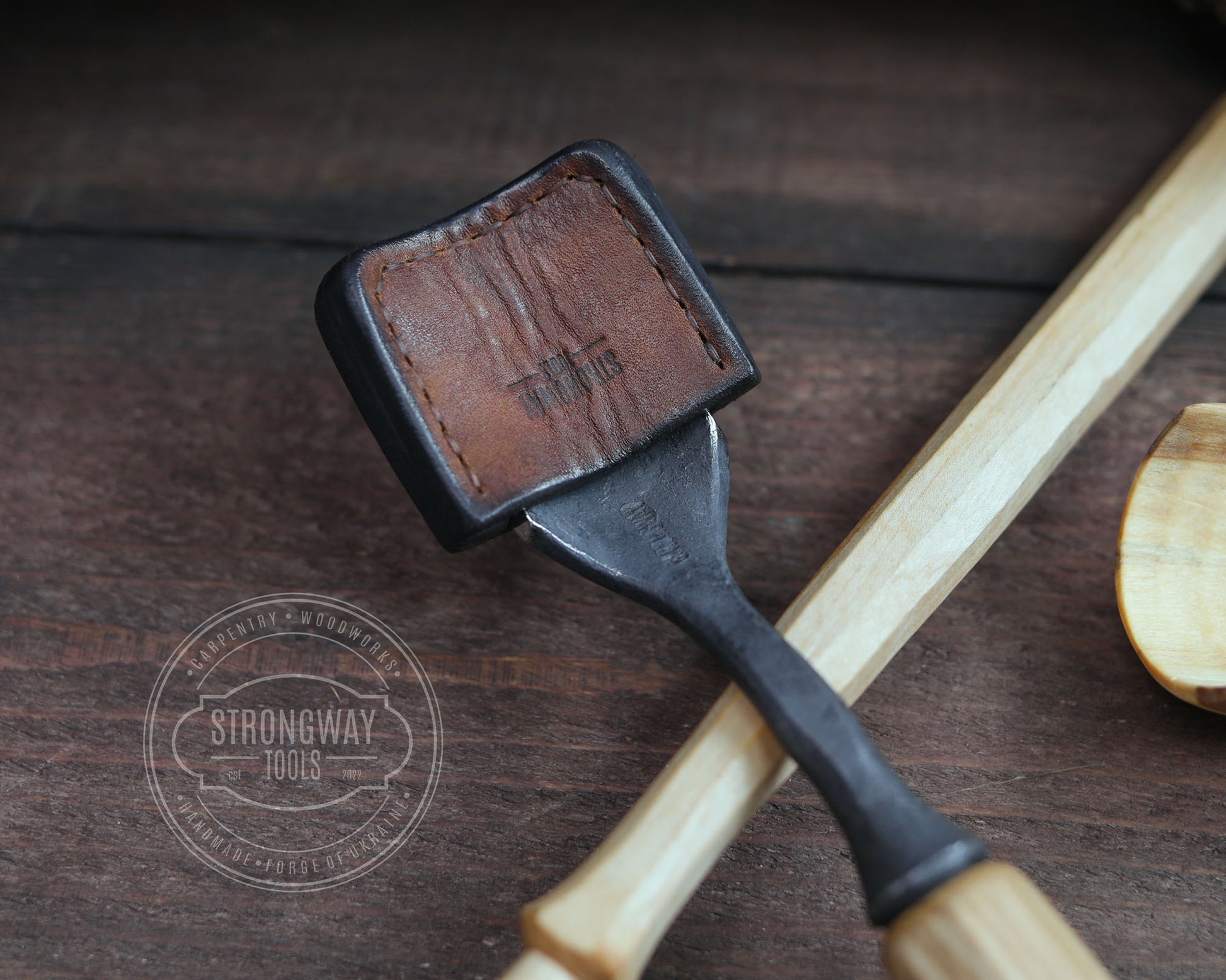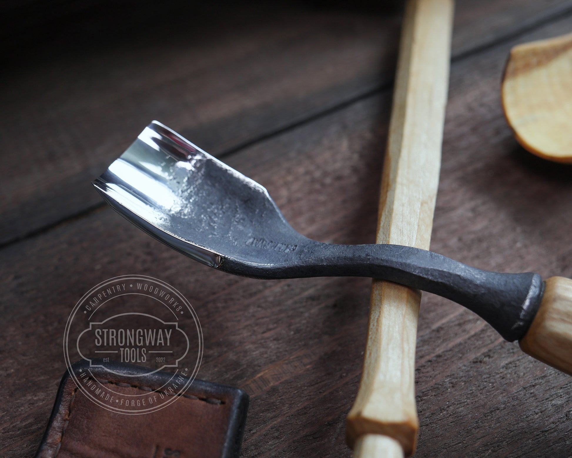 Leicht gekröpftes Hohleisen mit hochwertiger Lederscheide, Handgeschmiedet