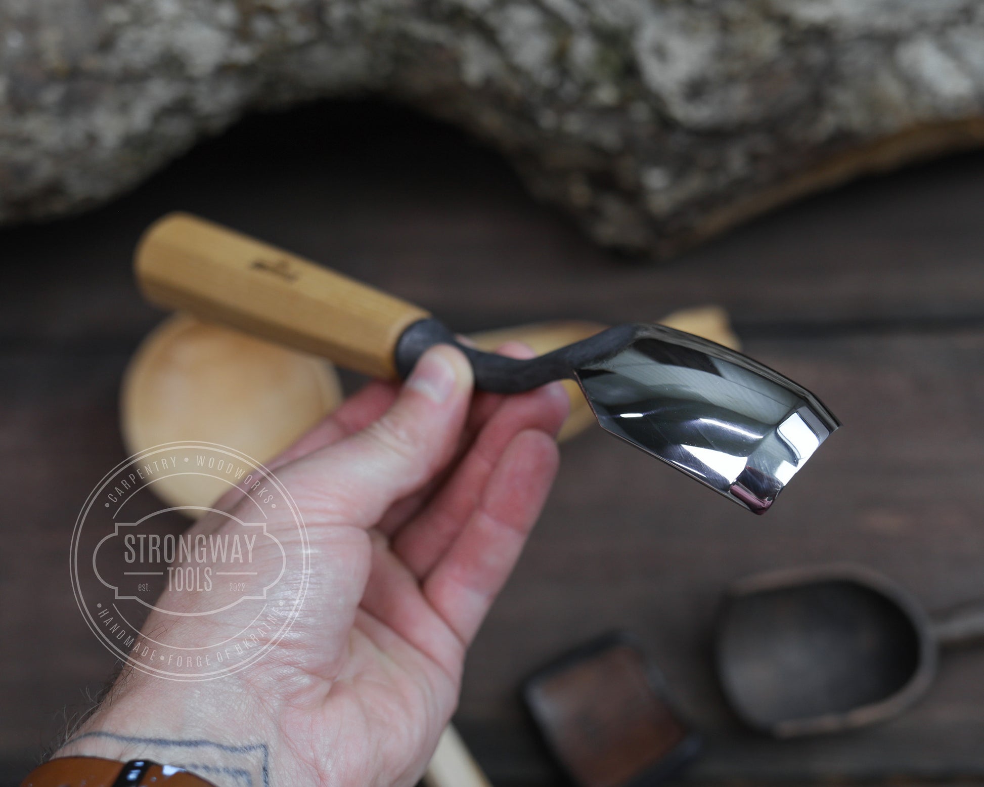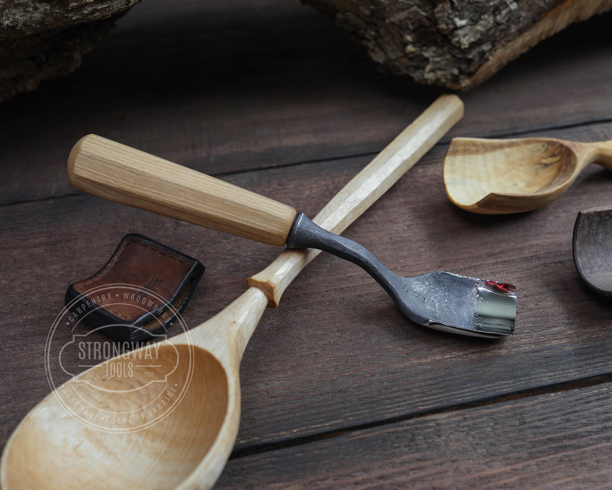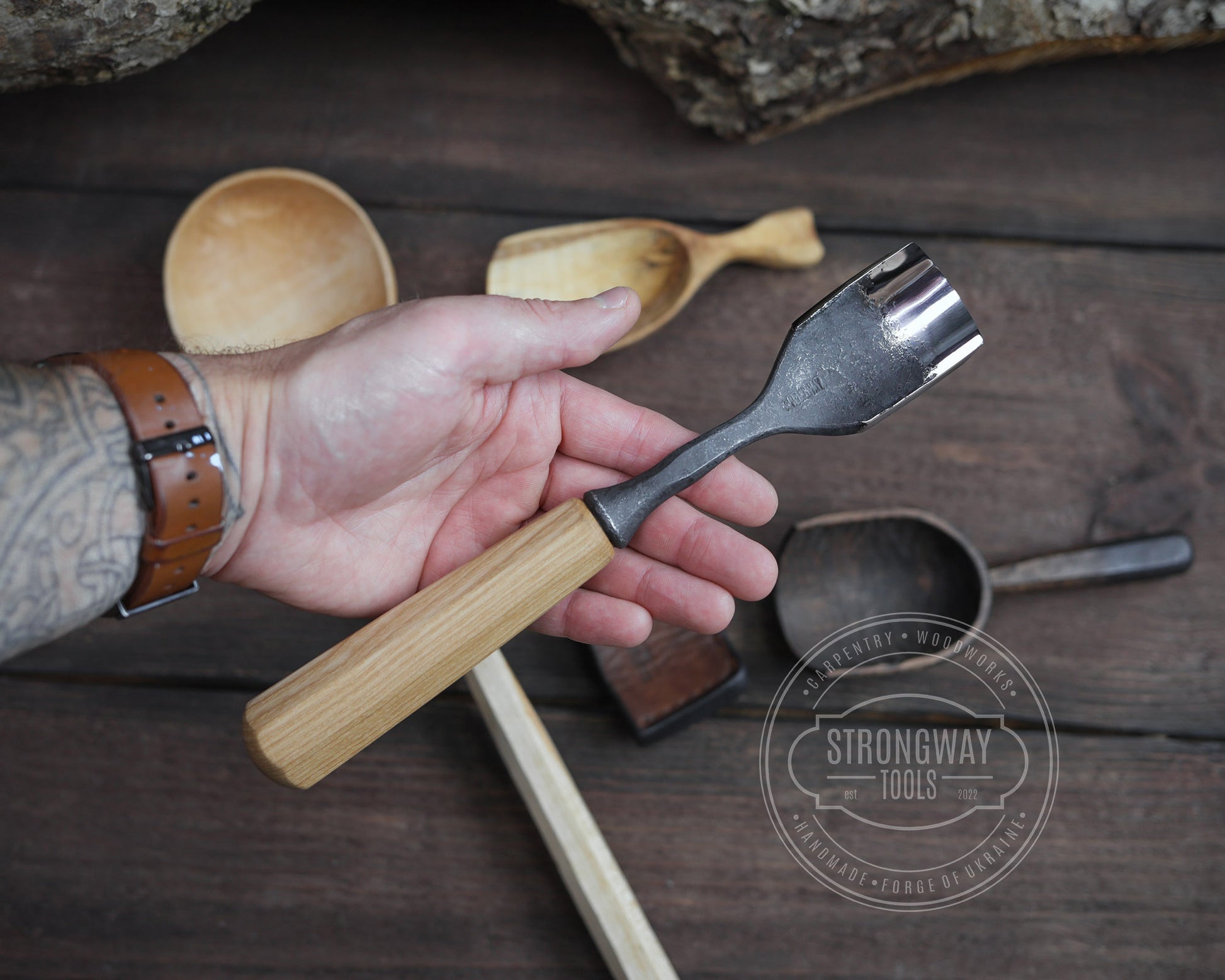 Leicht gekröpftes Hohleisen mit hochwertiger Lederscheide, Handgeschmiedet