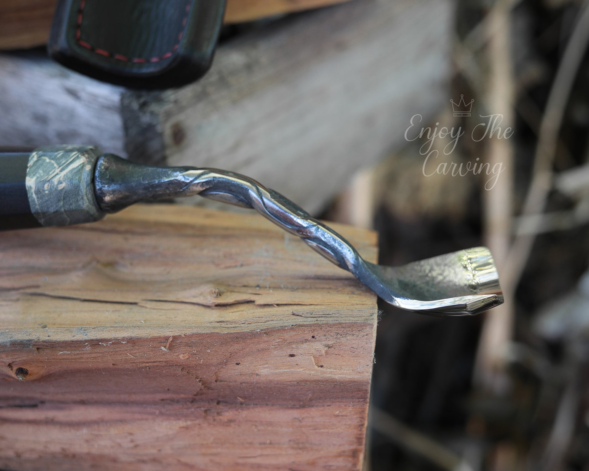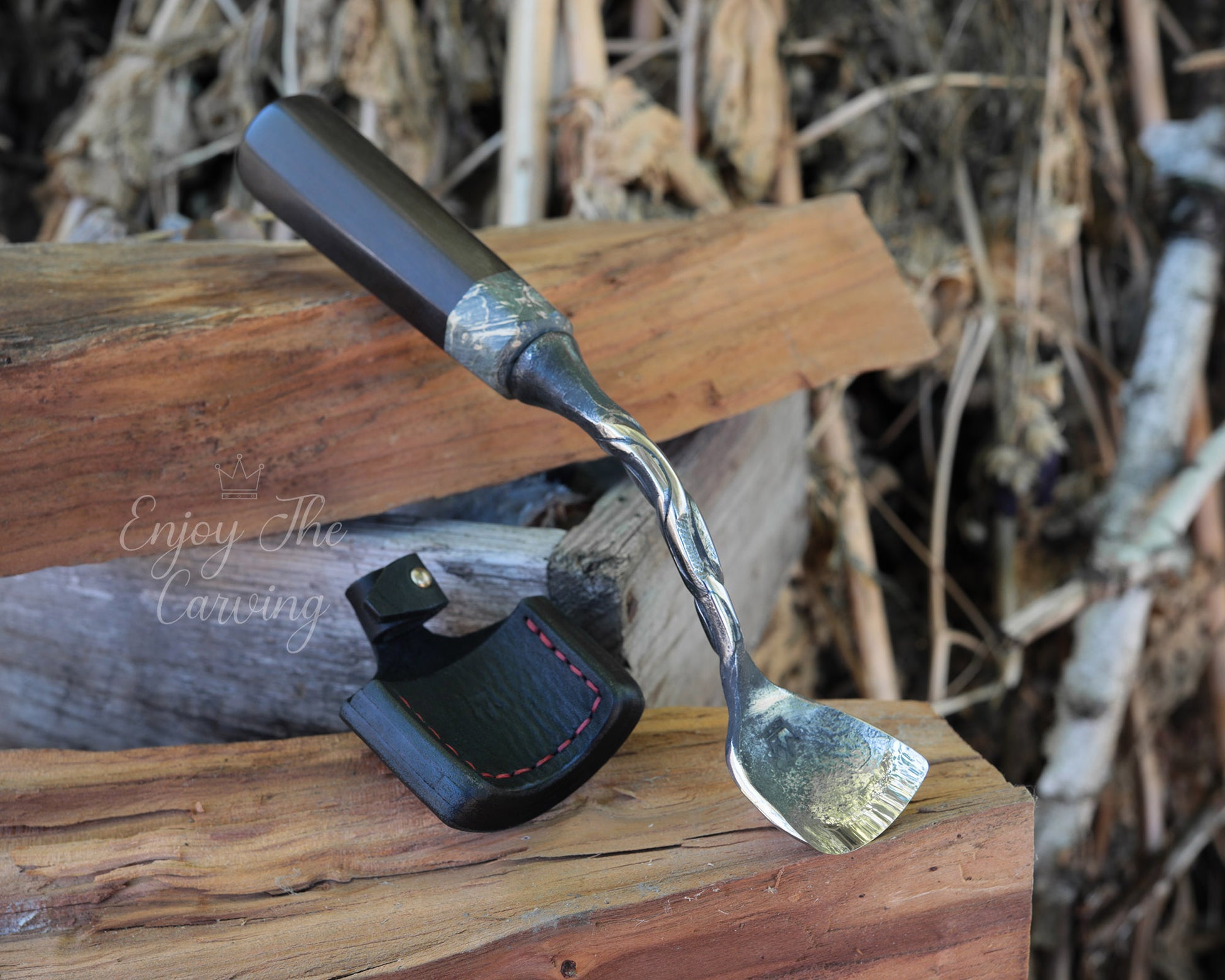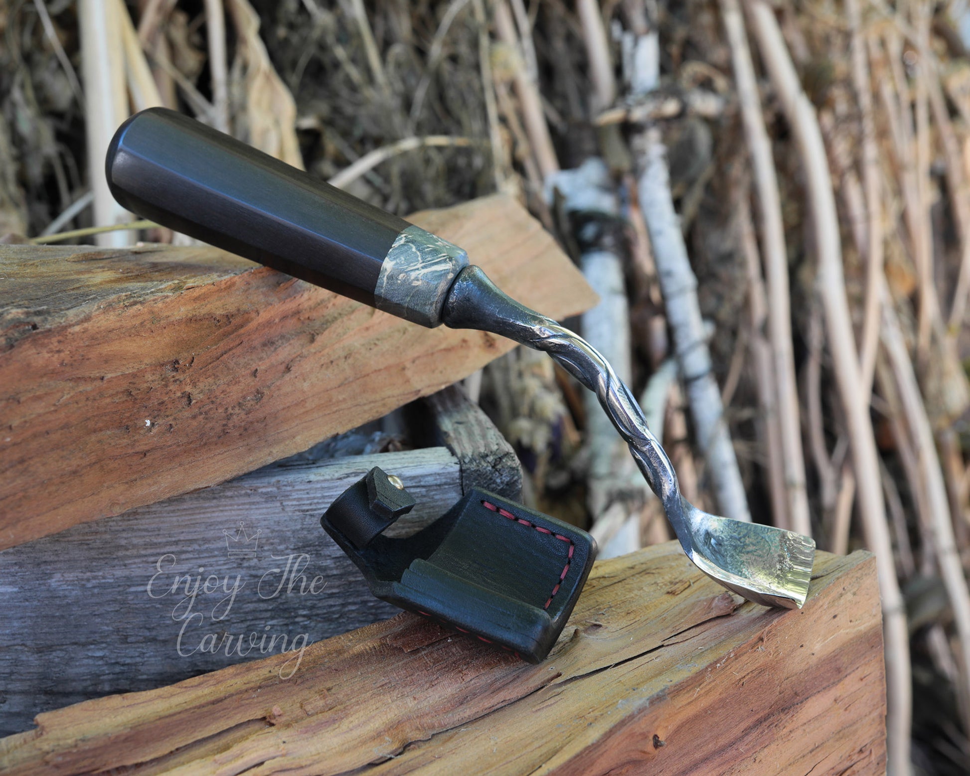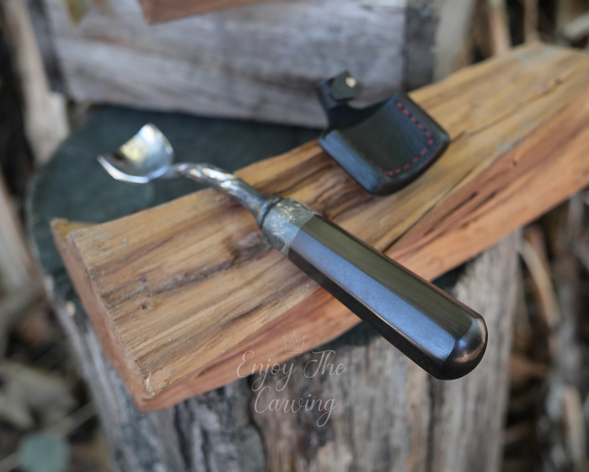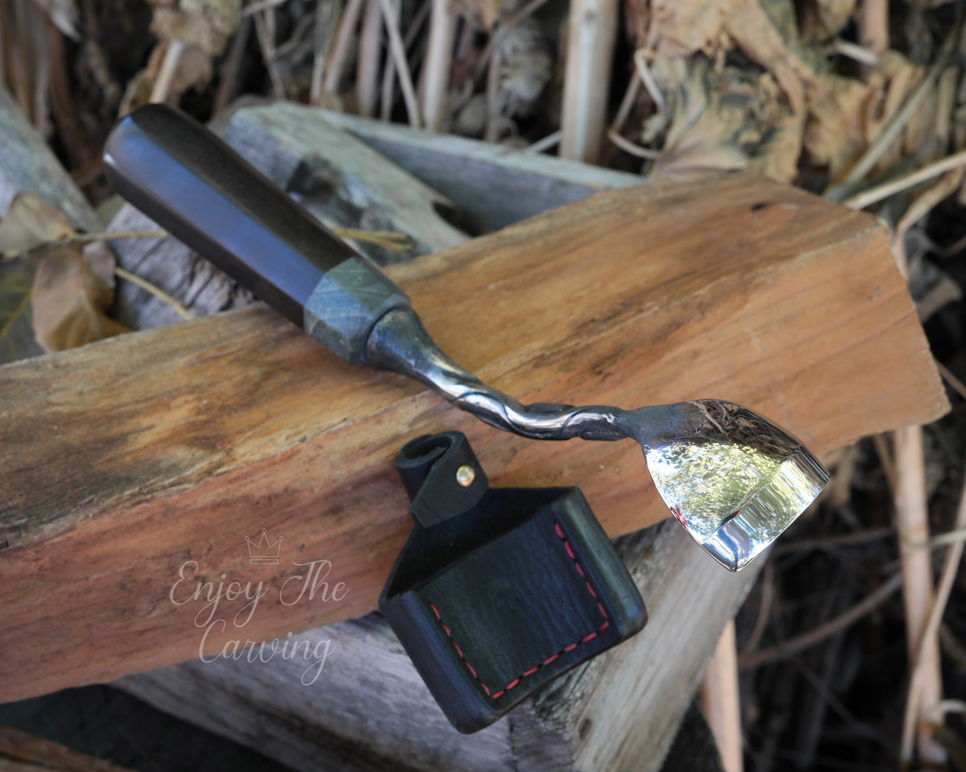 Handliches Hohleisen, 40 mm, "Löffeleisen", tief gekröpft, BLACK EDITION von Hand geschmiedet, mit hochwertiger Lederscheide.