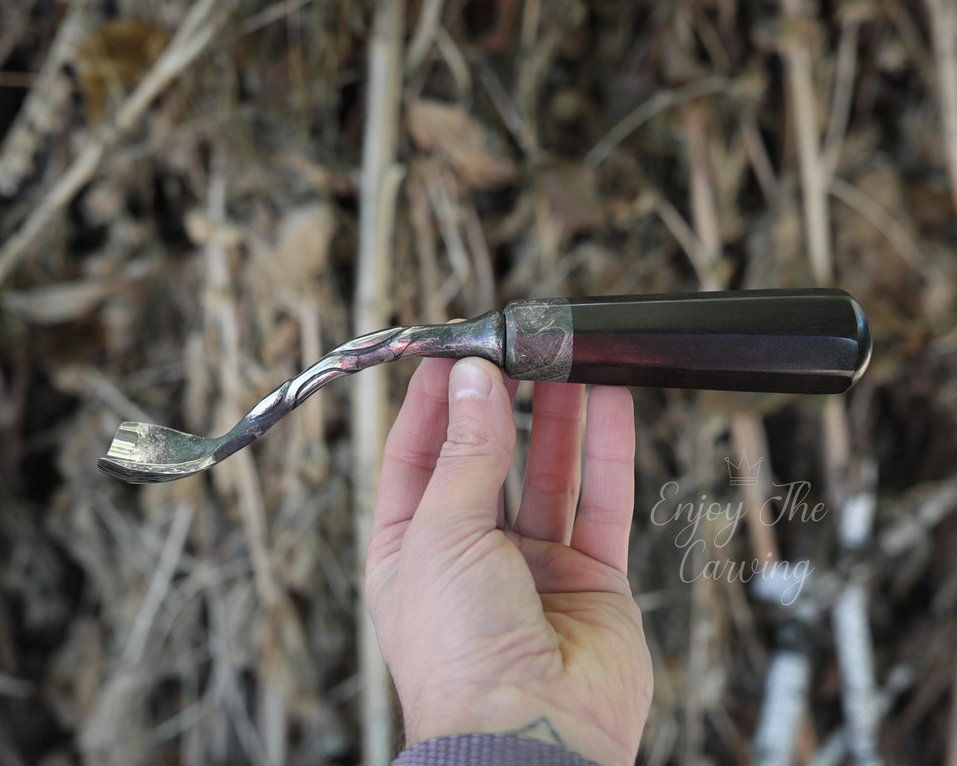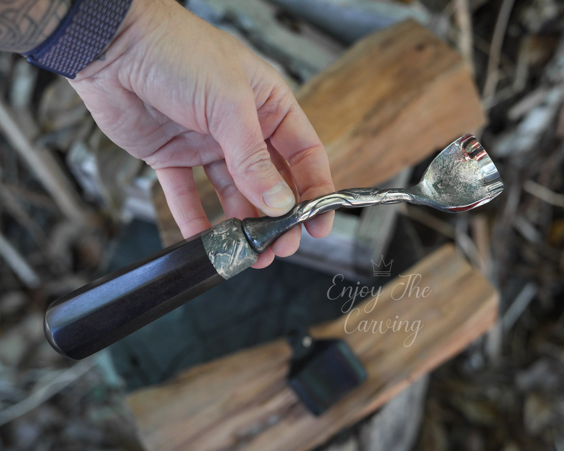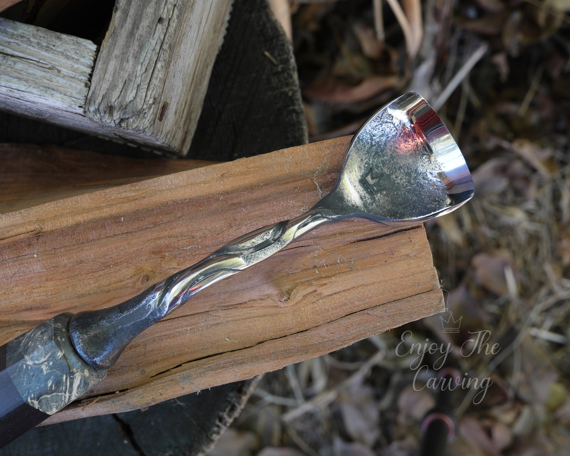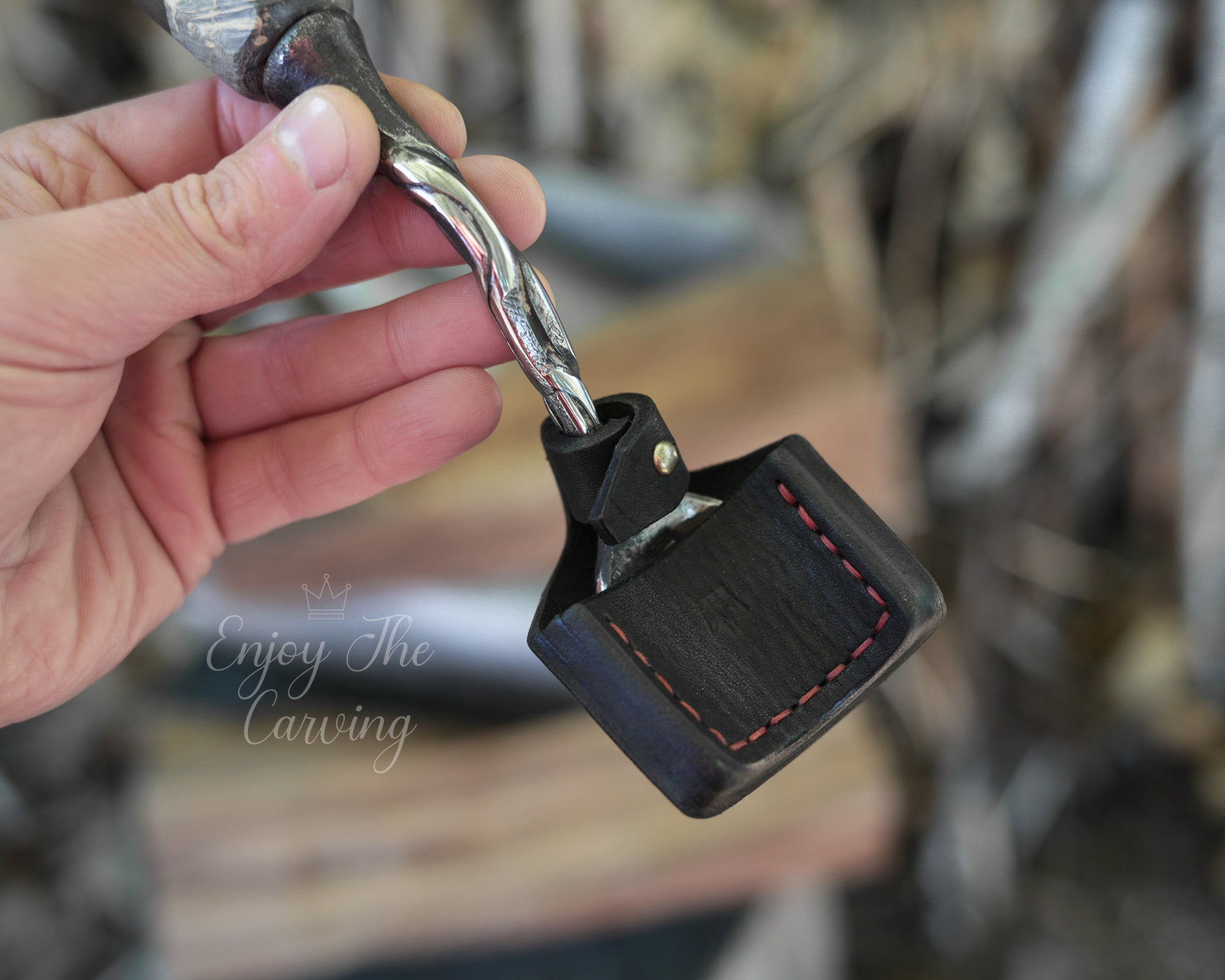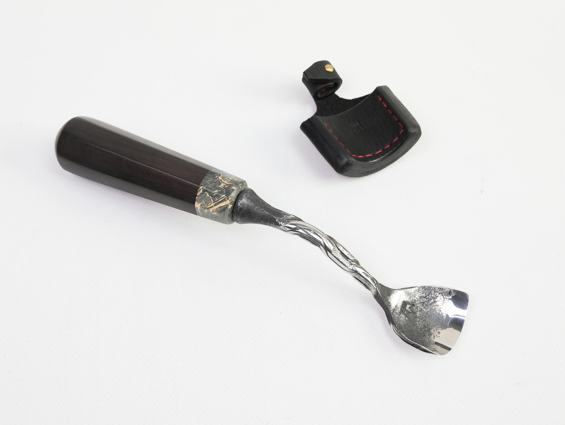 Handliches Hohleisen, 40 mm, "Löffeleisen", tief gekröpft, BLACK EDITION von Hand geschmiedet, mit hochwertiger Lederscheide.
