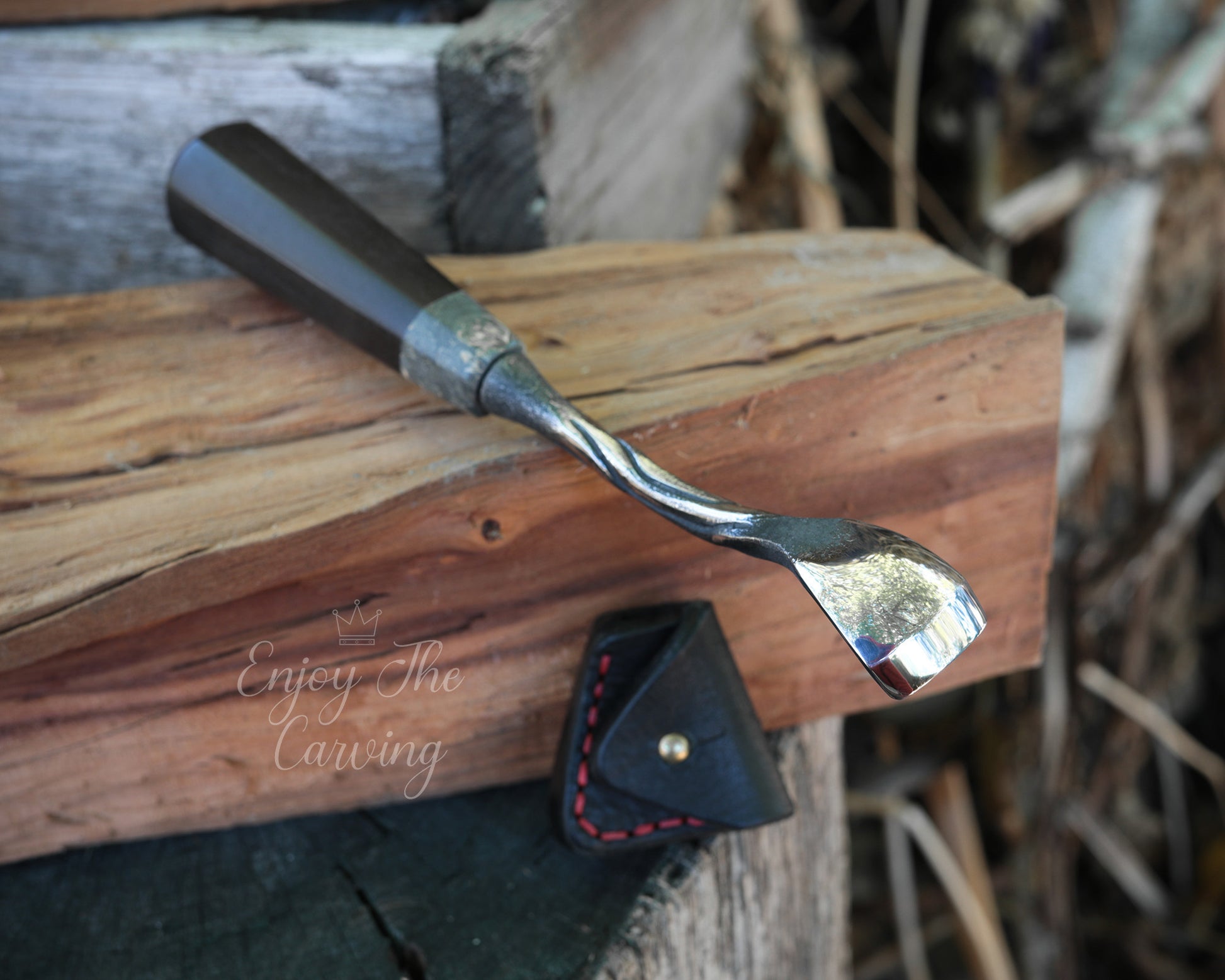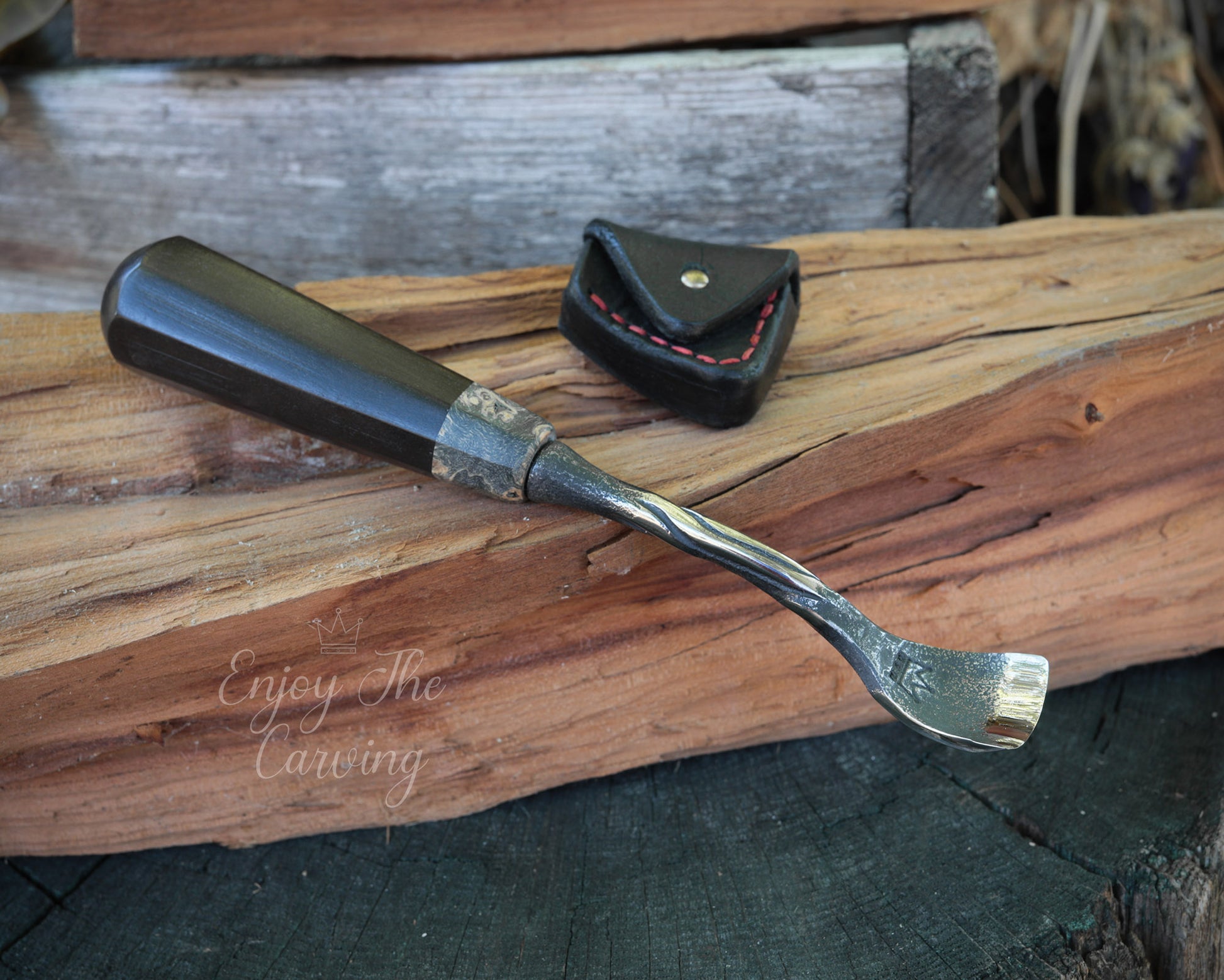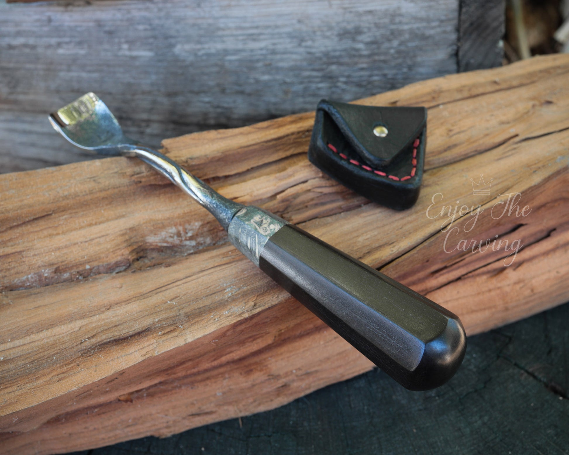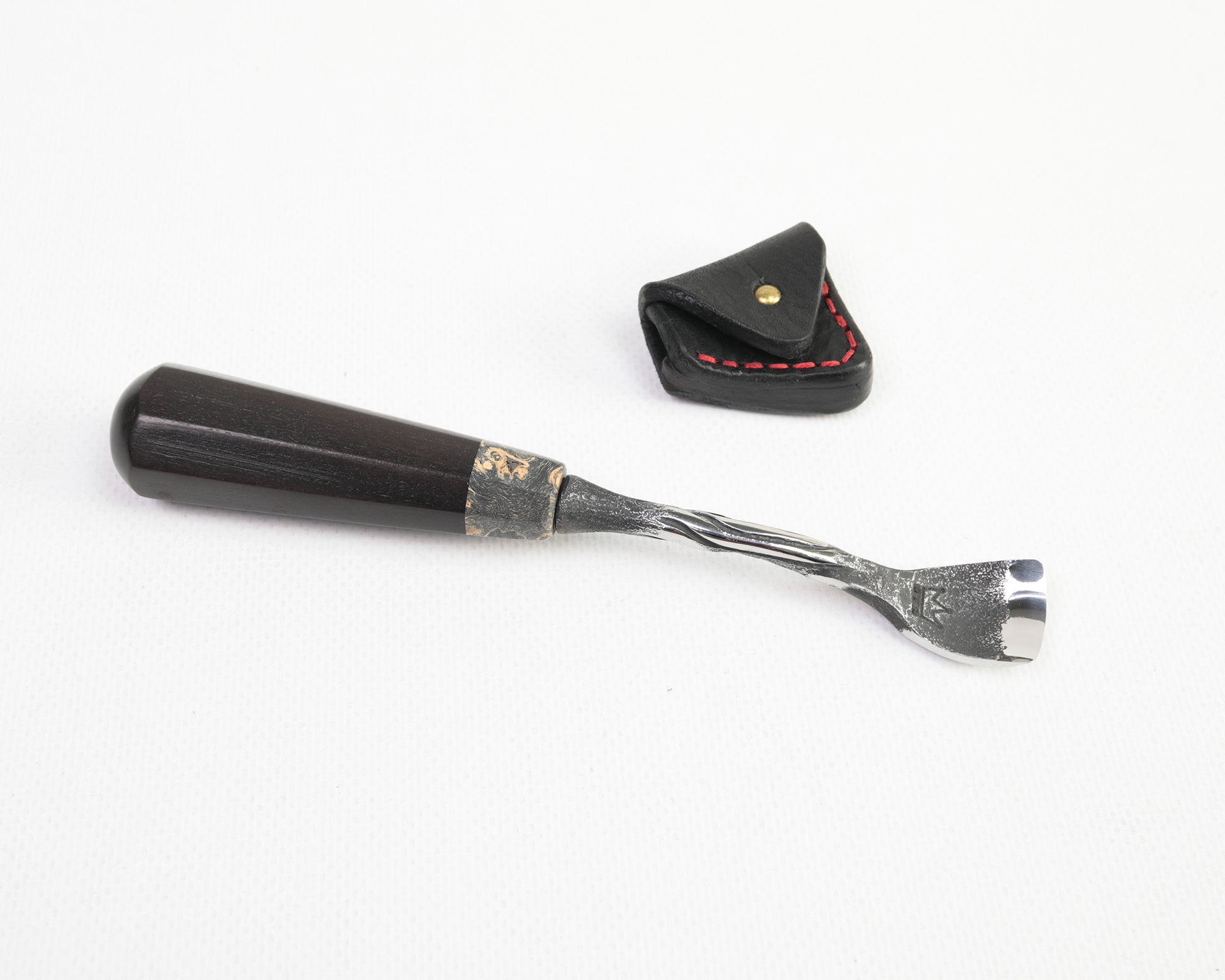 Handliches Hohleisen, 20 mm, "Löffeleisen", normal gekröpft, BLACK EDITION von Hand geschmiedet, mit hochwertiger Lederscheide.