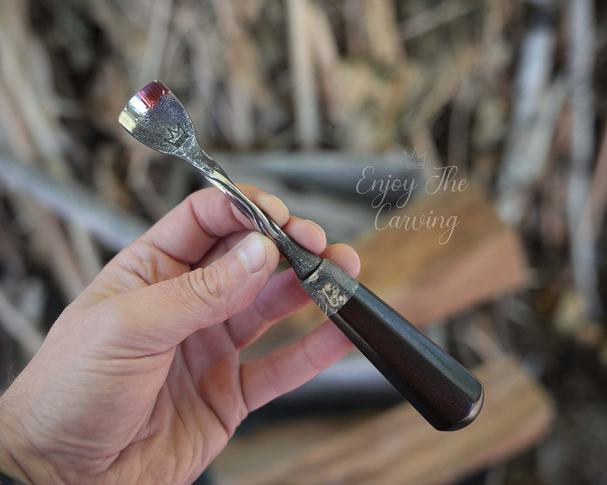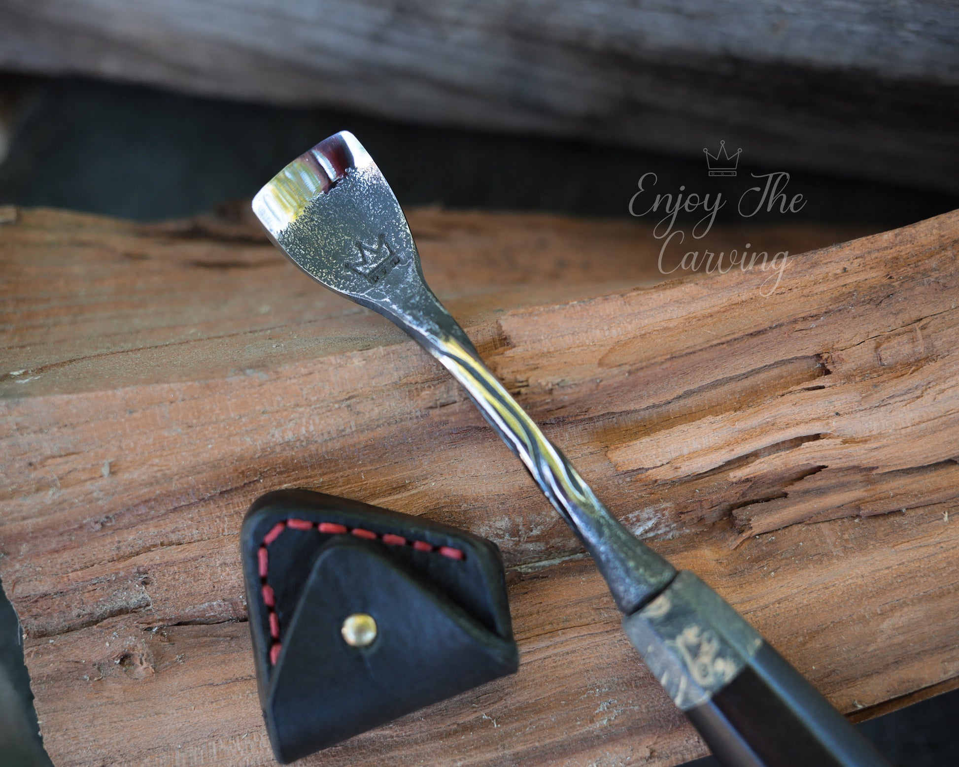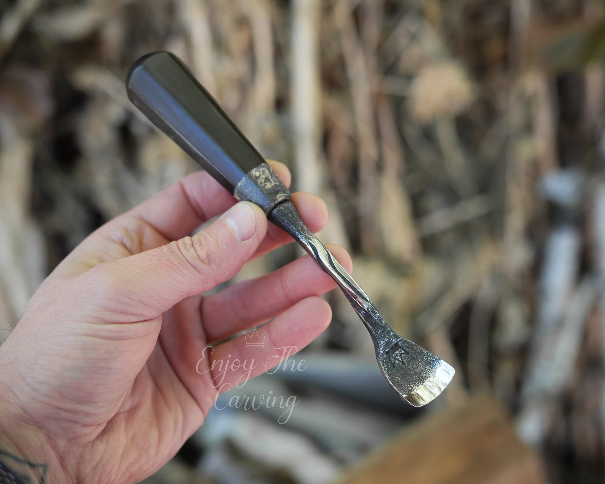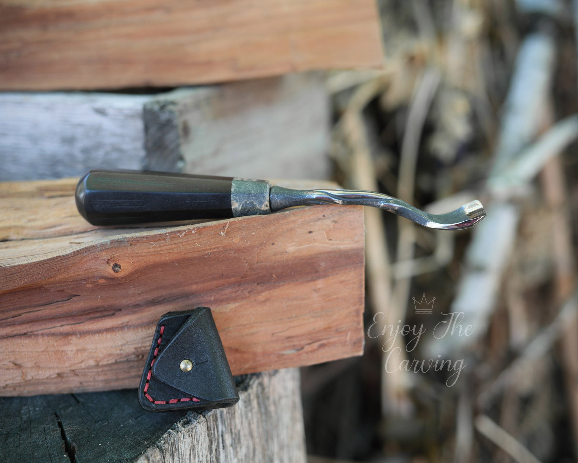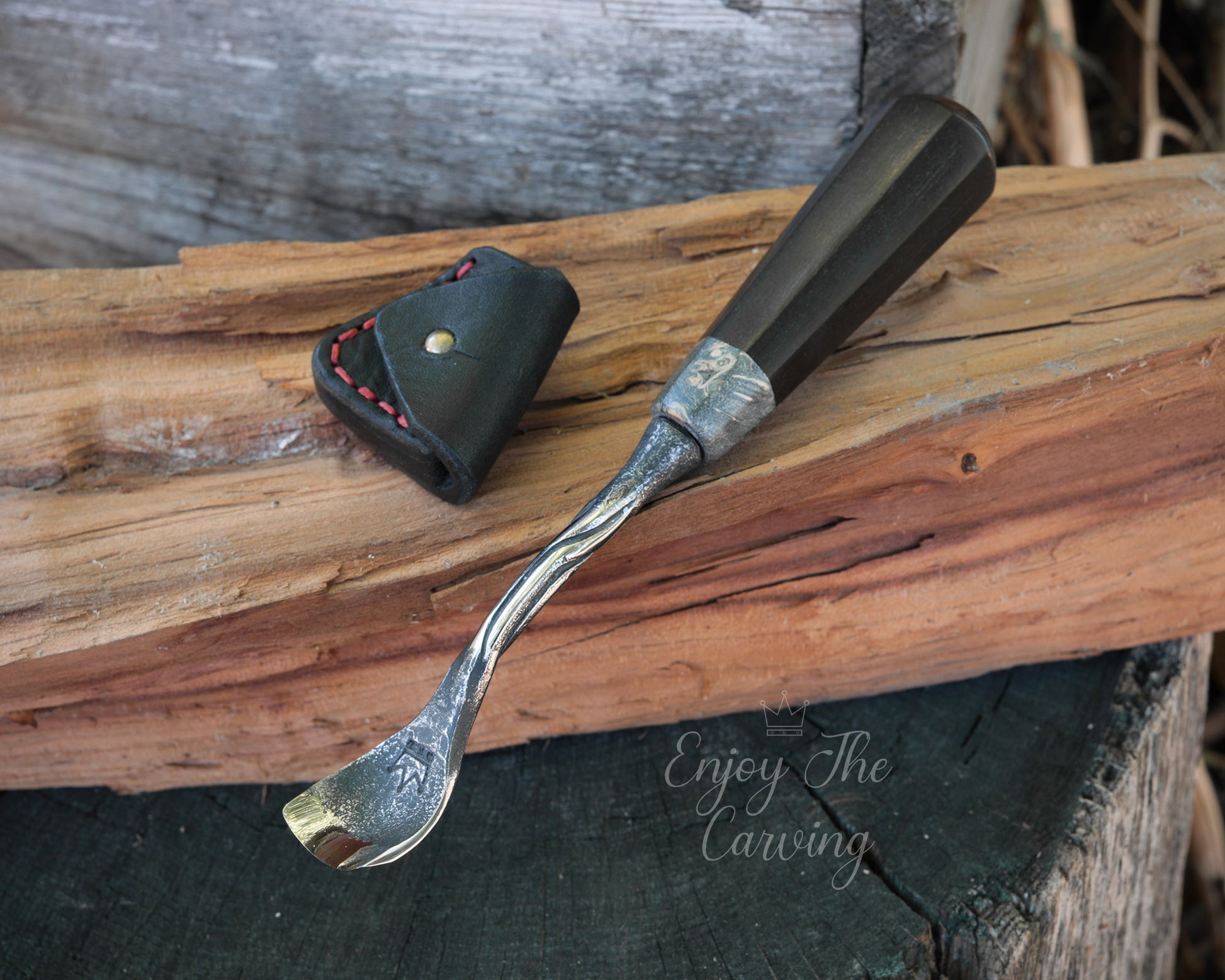Handliches Hohleisen, 20 mm, "Löffeleisen", normal gekröpft, BLACK EDITION von Hand geschmiedet, mit hochwertiger Lederscheide.