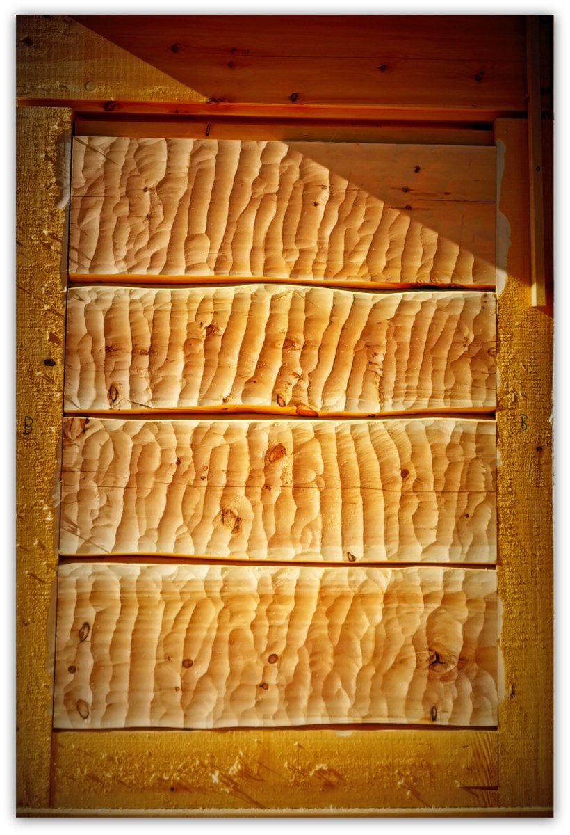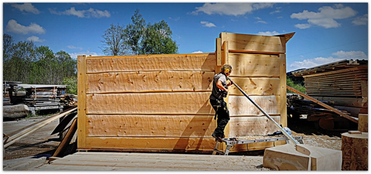 Erstaunlich nahe an dieses Ideal (und um ein vielfaches effizienter!) kommt jedoch die Oberflächenveredelung mit der ursprünglich als Rindenschälscheibe entwickelten Disc der Firma Lahzit aus Estland. Und das funktioniert sogar bei logs im aufgebauten Zustand!