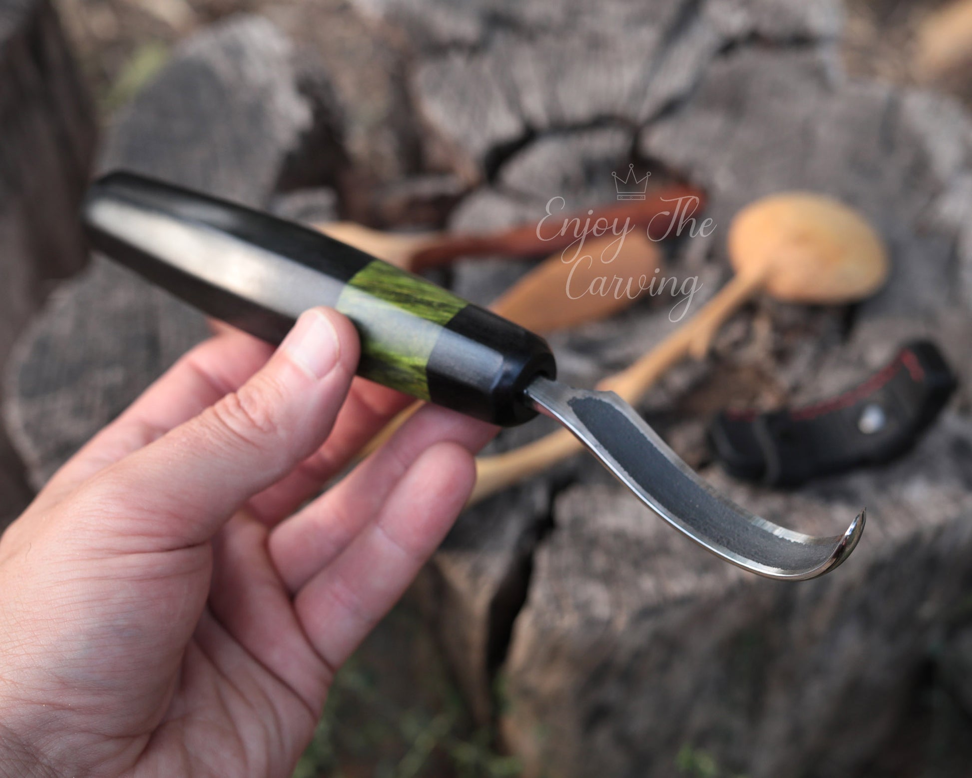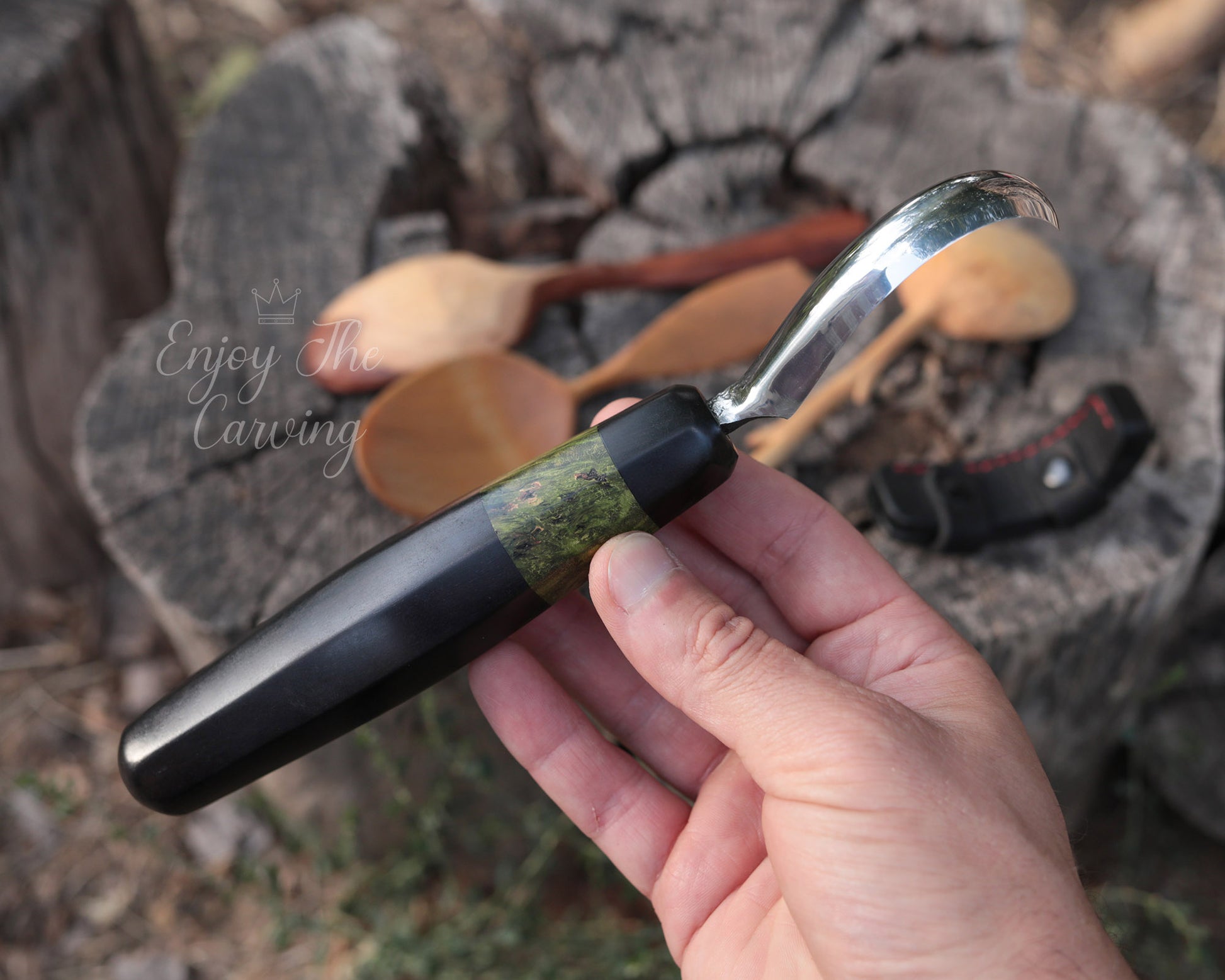 Löffelschnitzmesser, BLACK EDITION von Hand geschmiedet, mit hochwertiger Lederscheide.
