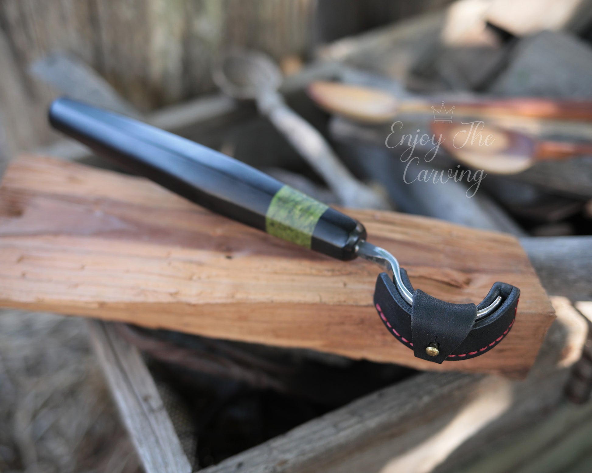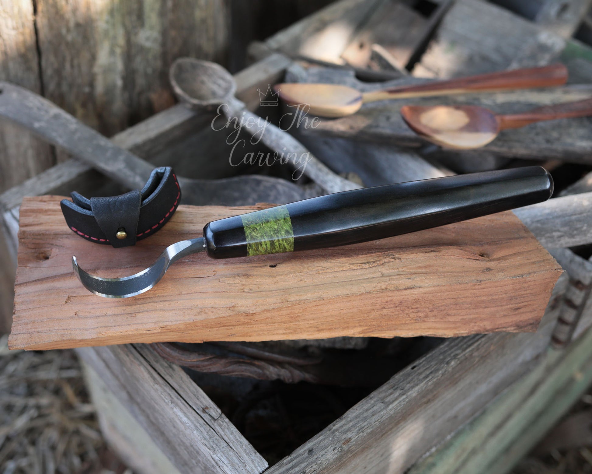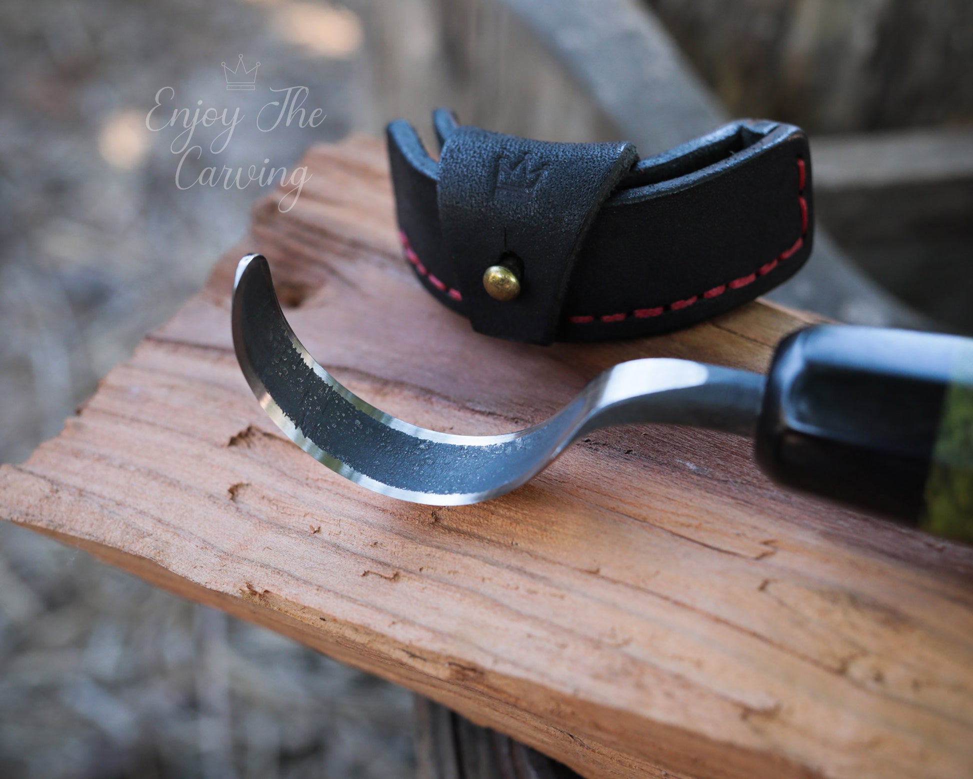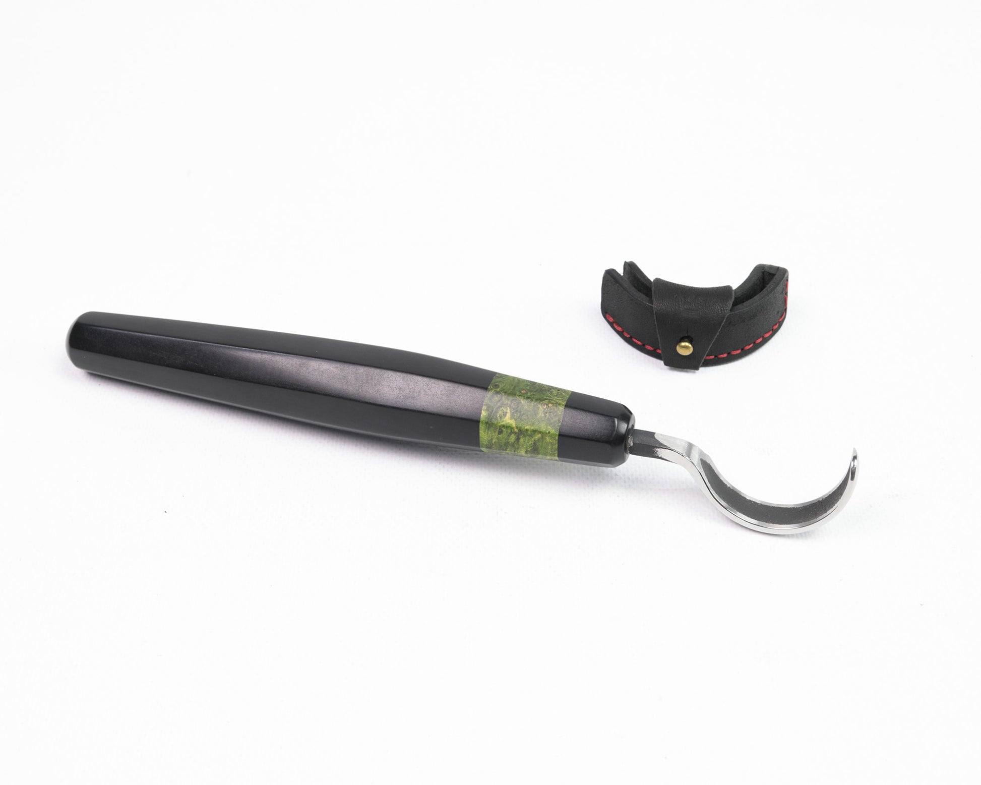 Schnitzmesser mit stark gekrümmter Klinge und langem Heft, BLACK EDITION von Hand geschmiedet, mit hochwertiger Lederscheide.